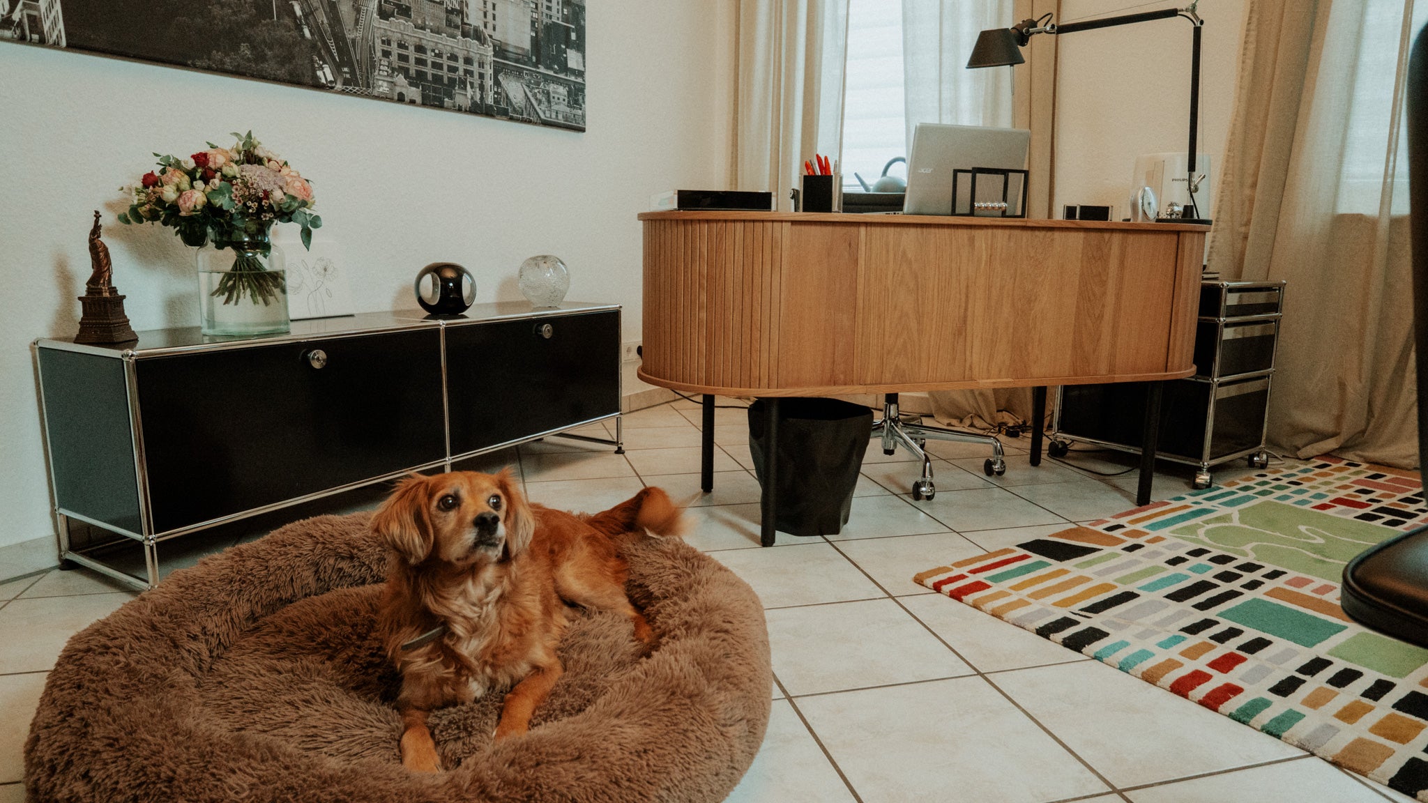 Unterstützt werde ich in manchen Sitzungen von meinem Therapiehund Goofy, der mit seiner ruhigen und freundlichen Art oft schnell Vertrauen schafft und eine besondere Atmosphäre der Nähe und Geborgenheit entstehen lässt.